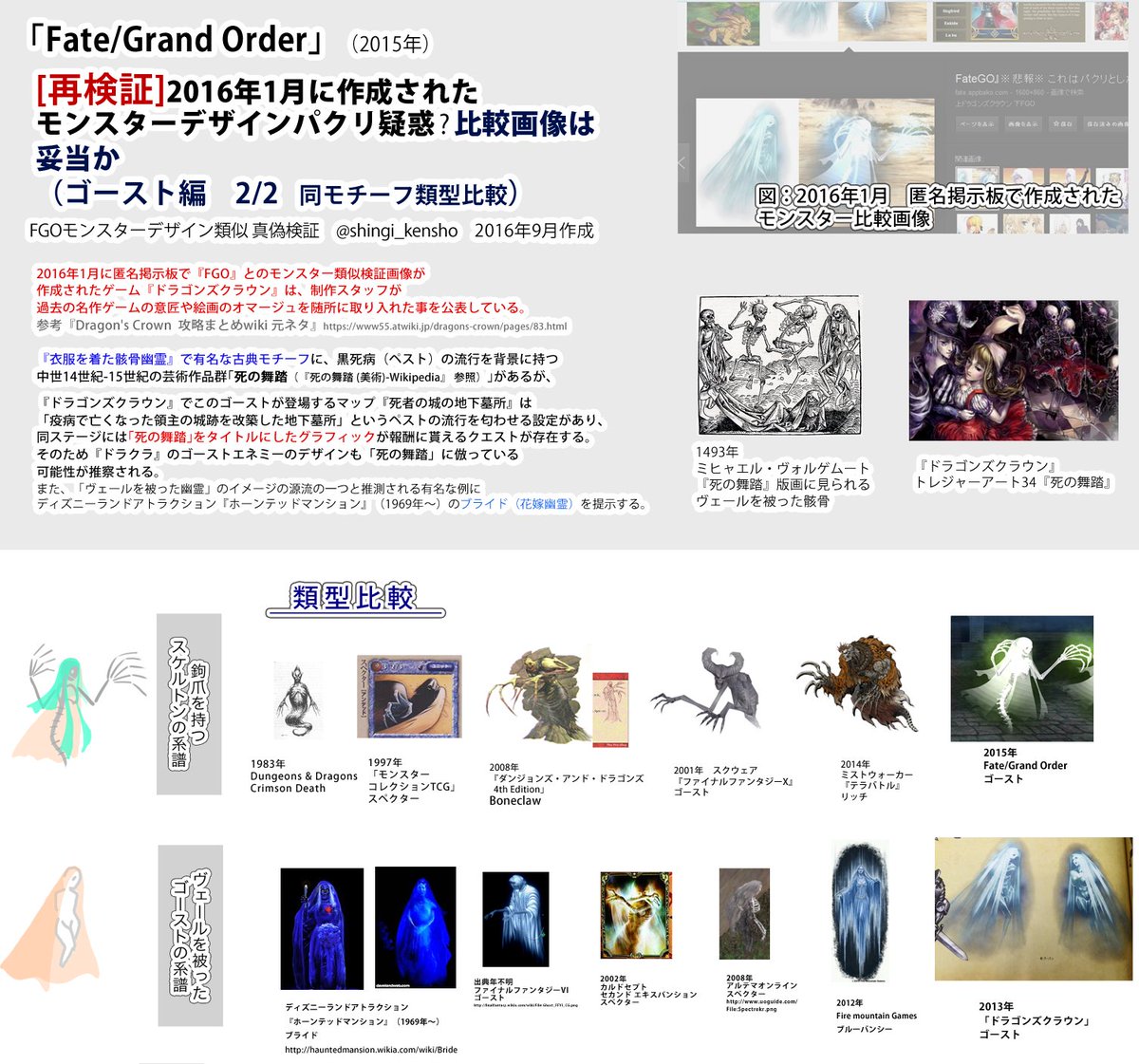 2015年開始のゲーム「Fate/Grand Order」のモンスターデザインが2013年発売のゲーム「ドラゴンズクラウン」の同モンスターに似ていると話題に。 パクリの嫌疑をかけた2chスマホアプリ板の住人がまともな検証もせず比較画像の体裁で「パクリ認定画像」 を作成。